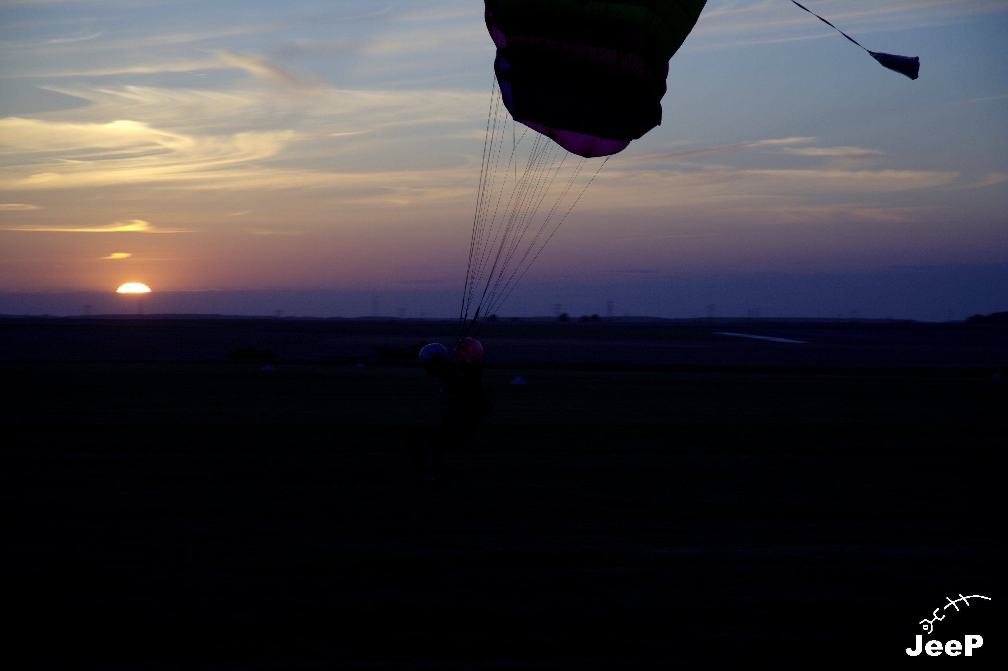 Le coucher de soleil était sympa. J’ai pris quelques photos en sous exposition pour faire ressortir les couleurs et c’est à ce moment la qu’un groupe de parachutiste s’est posé. Vite, vite, quelques photos prise a l’arrache et voila le résultat :