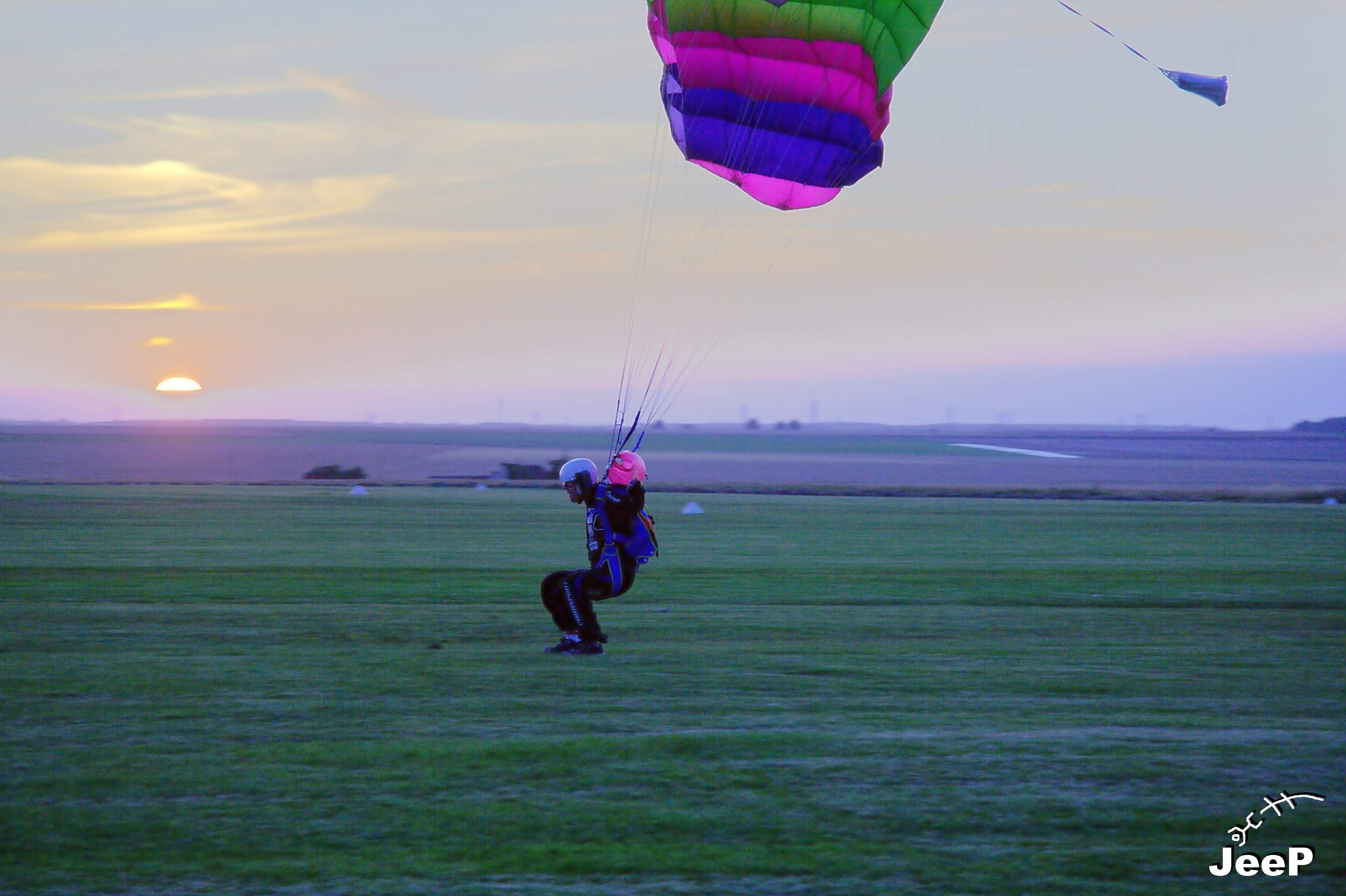 Le coucher de soleil était sympa. J’ai pris quelques photos en sous exposition pour faire ressortir les couleurs et c’est à ce moment la qu’un groupe de parachutiste s’est posé. Vite, vite, quelques photos prise a l’arrache et voila le résultat :