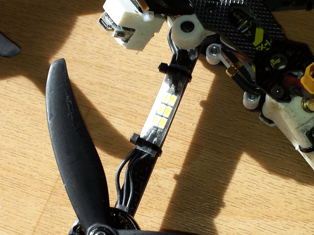 Ce RaceWire a des led dessus : c’est zouli même si ça sert à rien : en FPV, on les voit pas ... Mais ça permet de voir s’il y a du courant qui passe. Inspection visuelle des autres soudures : pas de problèmes à priori. J’ai pas remplacé les autres fils par des racewire, flemme ...
